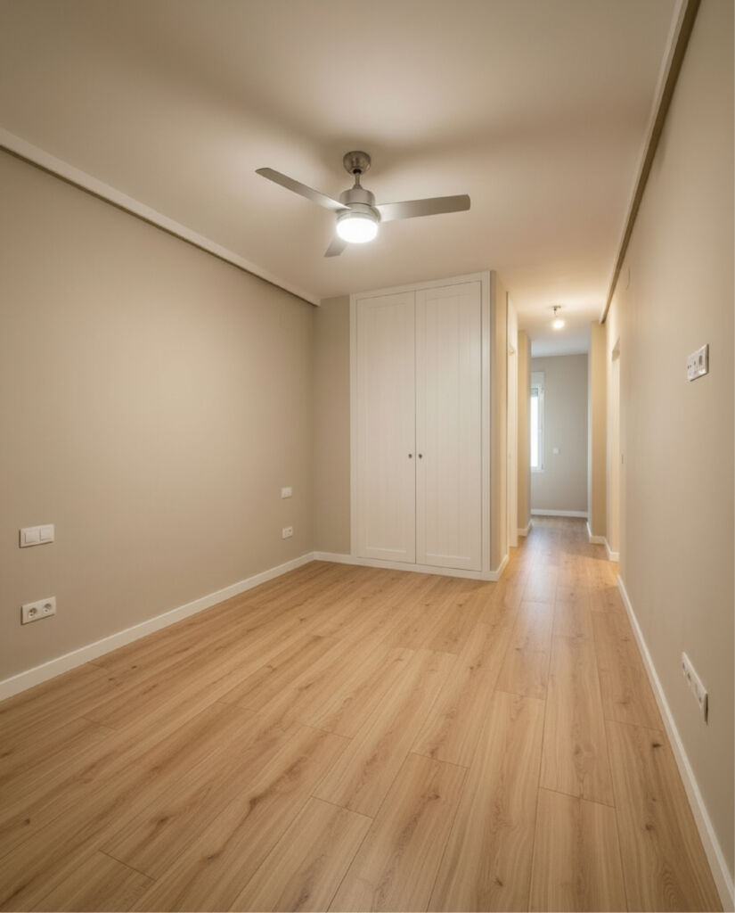 La nueva distribución potencia los espacios abiertos y la continuidad visual, permitiendo que la luz natural sea protagonista en toda la vivienda. Los acabados en tonos neutros, combinados con el pavimento efecto madera, aportan calidez y equilibrio, creando un ambiente contemporáneo y atemporal.